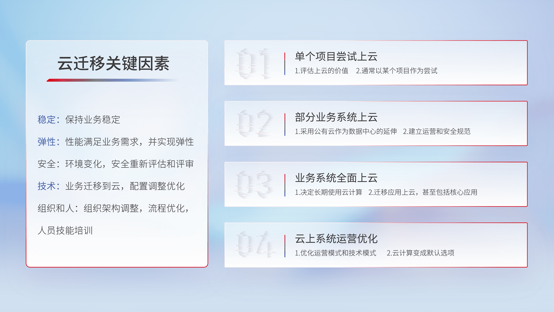 结合实际业务,,从规划设计、、云平台选型、、、、云原生改造、、、数据迁移、、集成交付,,,迁移全过程为客户识别最佳上云路径,,,,做好风险识别管理,,设计网络架构、、身份权限、、、、安全审计合规、、、、操作审计、、日志审计、、监控告警策略、、、、多站点容灾设计等,,对云上基础设施进行整体规划,,,,提升IT治理水平,,以满足弹性、、、、高可用、、、、高性能的需求。。。。