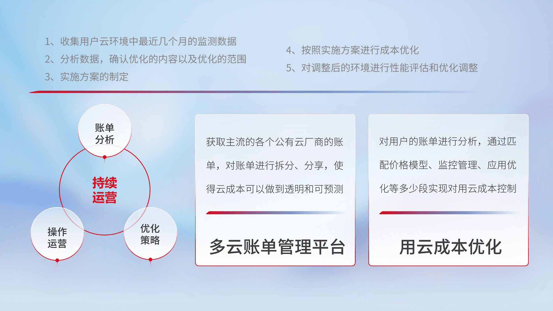 通过多云纳管,,,,以统一的资源数据模型把客户的云资源进行抽象和封装,,,,进而实现对多云资源的统一操作,,,保障云资源管理的可靠性、、稳定性与可用性。。。。量身定制化运维内容,,,配置、、、开发运维、、、补丁管理、、、备份、、、、监控、、认证和访问管理、、、审计和日常巡检等,,,,保障在用云过程中的可靠度,,,,稳定度以及高可用率。。
