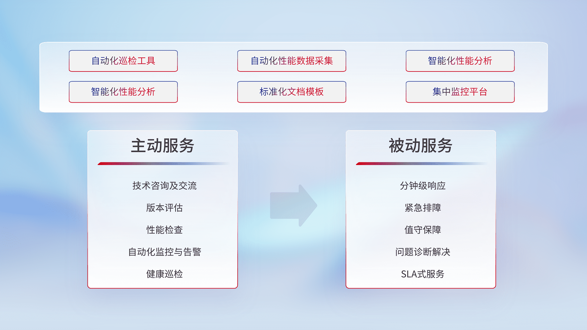 智能化工具和标准化文档,,,保障服务质量,,,提供主动服务(包含技术咨询、、、版本评估、、性能检查、、、、自动化监控与告警、、健康巡检)和被动服务包含(分钟级响应、、、、紧急排障、、值守保障、、、、问题诊断解决、、、SLA服务)。。。。